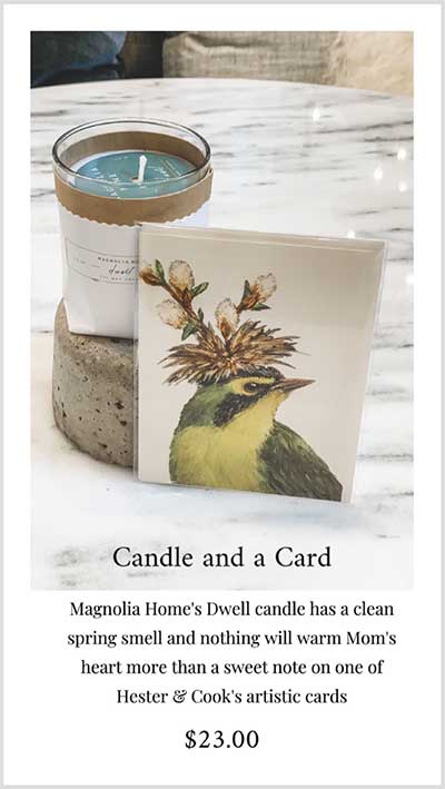 All the moms out there know, nothing is sweeter than loving words from their children. These Hester and Cooks blank cards are perfect to articulate how much mom means to you, and the art work is so beautiful, she will want to frame the card. Add one of 4 different scents from Magnolia Home’s collections to round off this gift. Gift giving over lunch with your mom or grandmother, and she’ll be over the moon.